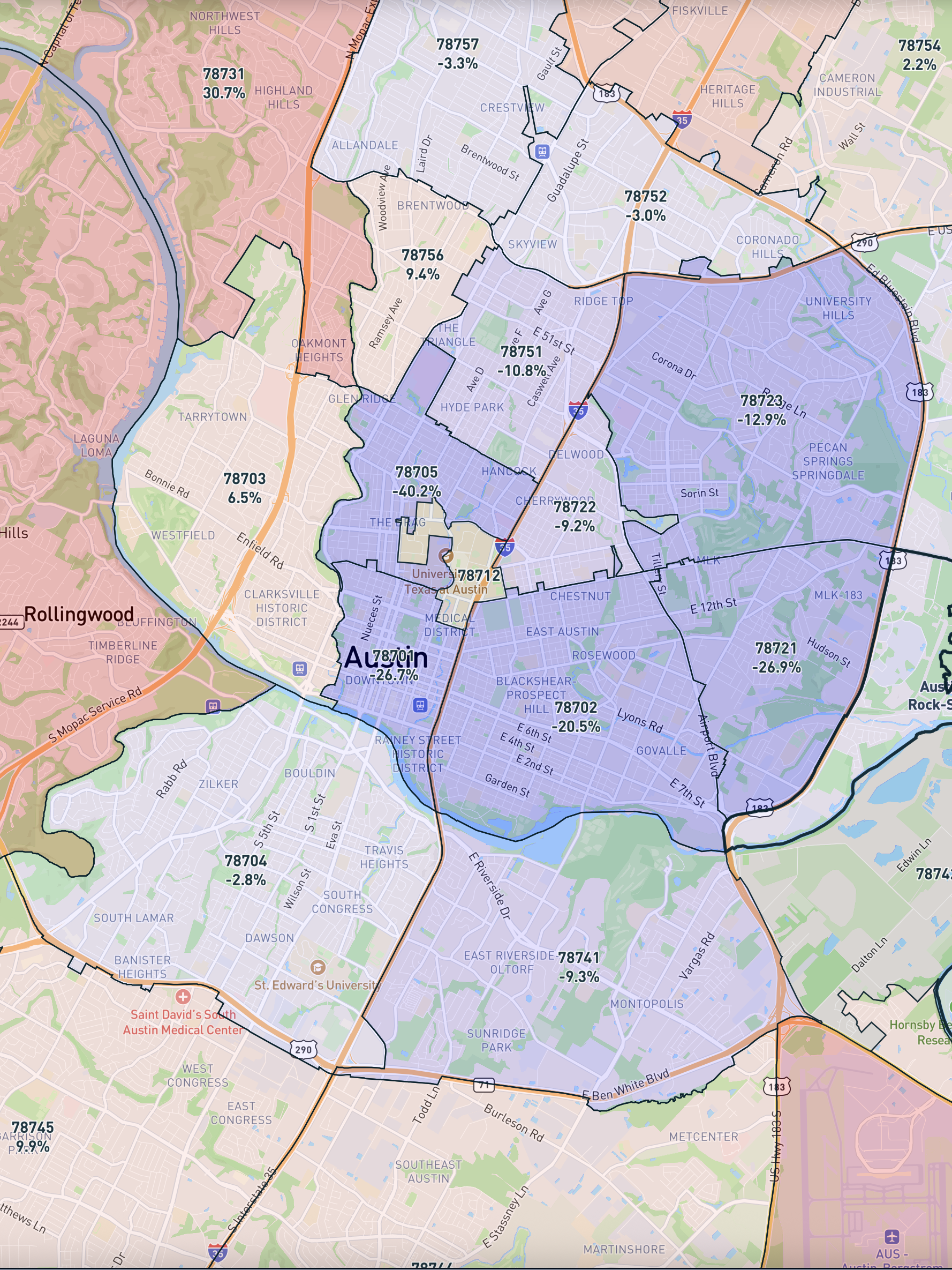 As you probably know, Austin real estate saw a major price surge during the pandemic – some neighborhoods rose nearly 60%. But since July 2022, prices have cooled across the board. Lately, though, we’ve seen an interesting shift: according to the ReVenture app, the four East Austin ZIP codes appear to have overcorrected and are now considered undervalued by an average of 17.3%. Click here to view the full Central Austin map. If you’d like to discuss what this means for your specific situation, and whether now is a safe time to buy or sell, feel free to reach out!